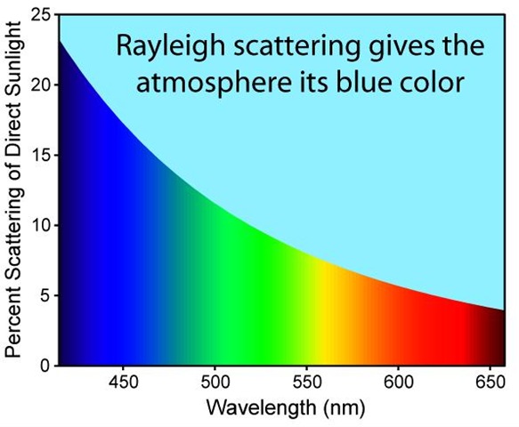 Have you ever wondered as to why does the sky appear blue and not any other color on a sunny day? The sunlit sky appears blue because air scatters short-wavelength light more than longer wavelengths. Since blue light is at the short wavelength end of the visible spectrum, it is more strongly scattered in the atmosphere than long wavelength red light. The result is that the human eye perceives blue when looking toward parts of the sky other than the sun. Rayleigh Scattering gives the atmosphere its blue color.