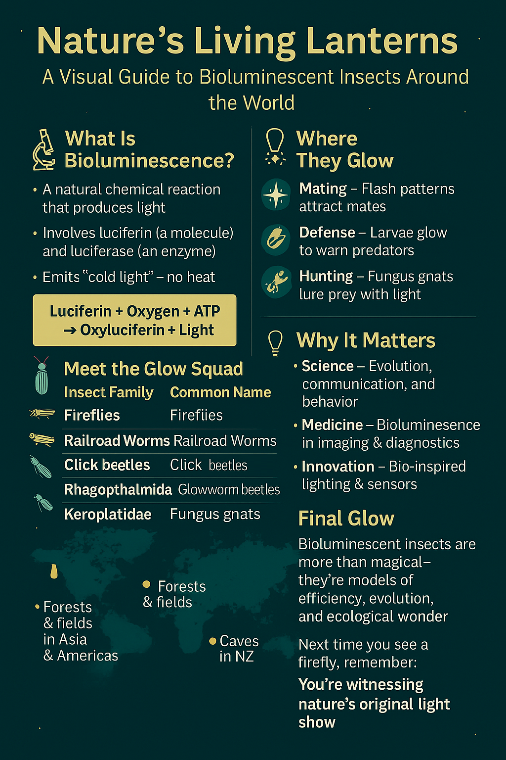 | Insect Family | Common Name | Region Found | Glow Color | Purpose of Glow |
